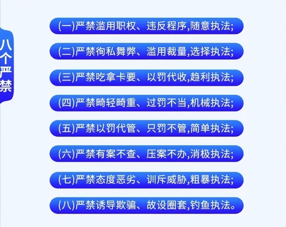 从去年开始,国家相关部门就明确表态要规范执法行为。市场监管总局迅速响应,发布《关于牢固树立监管为民理念 推行服务型执法的指导意见》和《市场监管执法行为规范》。其中,《市场监管执法行为规范》对市场监管执法人员的行为进行了全方位的规范,从作风纪律、仪容举止,到执法用语和案件办理流程,均提出明确且严格的要求。尤其是“八个严禁、十个不得”规定,剑指随意执法、趋利执法等各类执法乱象,为执法人员划出了清晰的行为红线,要求执法人员坚决杜绝此类问题。